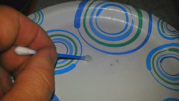 Una vez que estés contento con la forma que se adapta a todo, dejar a un lado el cable y mezclar una pequeña cantidad de epoxi parte dos en un plato de papel con un hisopo de algodón. Colocar los segmentos en la placa base y epoxy cuidadosamente hacia abajo con la torunda. No necesita mucho - lo suficiente como para fijar los segmentos y para sellar el cable a la placa para que epoxy coloreado no se escaparán en las otras áreas.