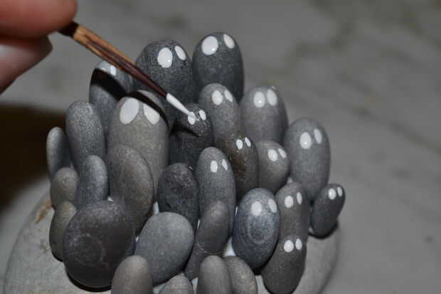 hacer 2 puntos pequeños en cada piedra con pintura impermeable blanca