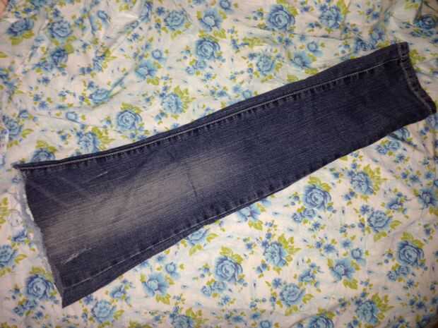 Tomar una de las piernas de jean ha cortado. Cortar un rectángulo que es un poco menos o más que la anchura de su mano y es tan largo como quieras el asa a ser.