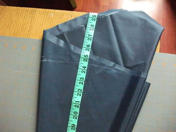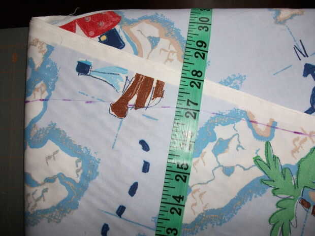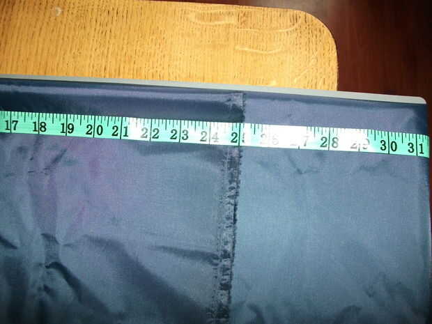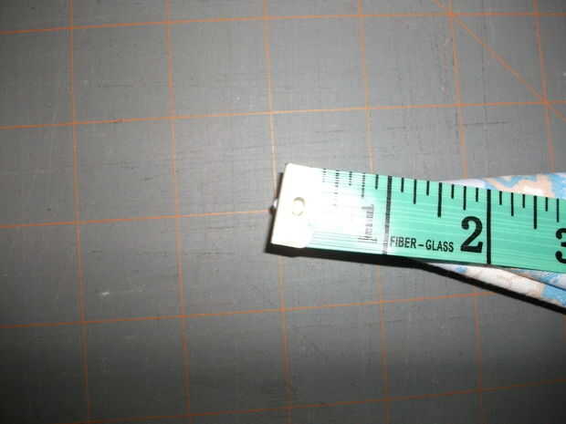Coloque la cinta métrica por lo que es el cero final en el punto y marca de su radio como se muestra (radio = mitad del diámetro, así que mi radios eran 24,5" y 27"). Gire la cinta métrica a lo largo del arco y haga más marcas como se muestra. Entonces Únete a sus marcas en una suave curva y corte a lo largo de la línea a través de todas las capas. Dependiendo del grosor de la tela puede que necesite cortar las capas de unos pocos a la vez. En este caso el lugar un peso en la tela doblada para mantener juntos, una lata de sopa es buena para esto.