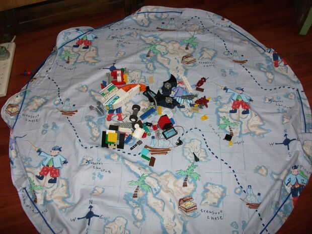 Simplemente extender la estera para jugar en él - aquí es con Lego.  Cuando su hijo (o usted) ha terminado jugando simplemente dibuje el cable de red, deslice la palanca de resorte hasta mantener la bolsa cerrada, meter el cable sobrante dentro de la bolsa y colgar el caboodle todo en la parte posterior de la puerta del dormitorio.