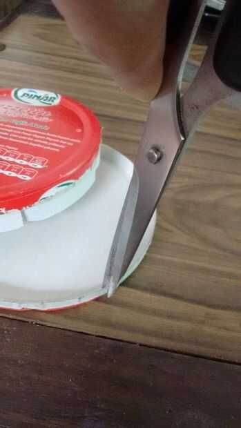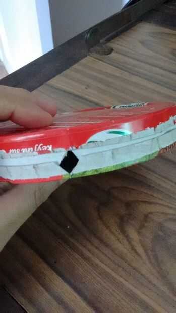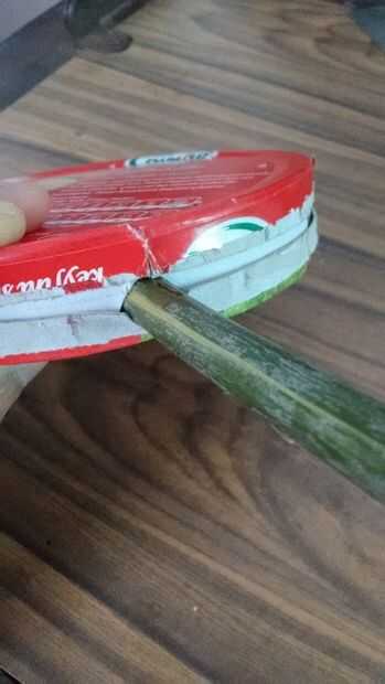 En la tapa hacen un corte y luego se corta para formar un corte triangular. La base de la caja más probablemente tienen una hendidura en un lado. Corte diagonalmente a esto para hacer un recorte triangular. Asegúrese de cortar lo suficiente como para permitir que el palo pase a través.