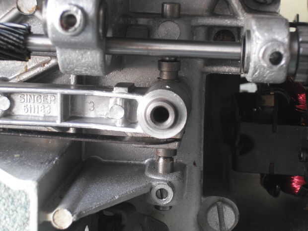 1. modificar el disco que va a la parte inferior y mueve el columpio del brazo (ver fotos) hacia arriba y hacia abajo y de lado a lado, de modo que sólo va arriba y abajo (y no de lado a lado) la misma distancia que el émbolo de la aguja principal. Esto sería una solución bonita, pero complicada porque podría tener la hoja ser conducido, o tirado, de ambos lados. Descuentan como terriblemente complicado.