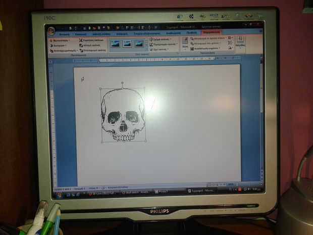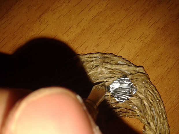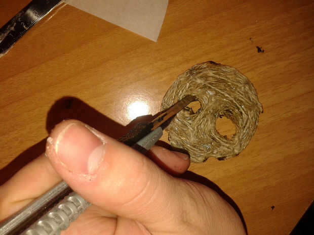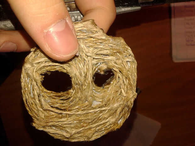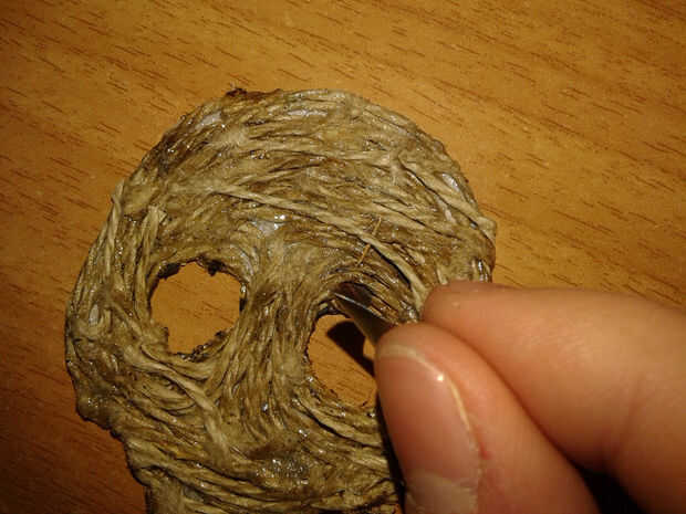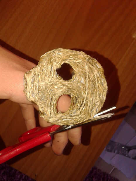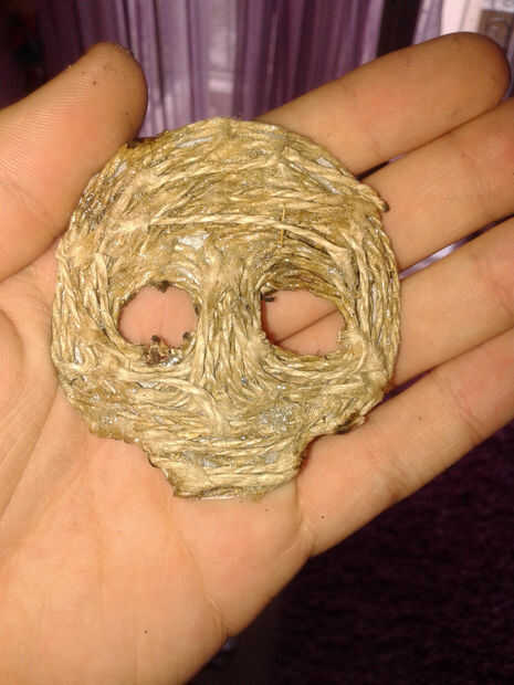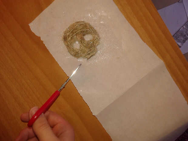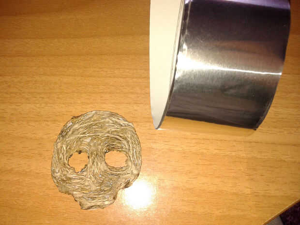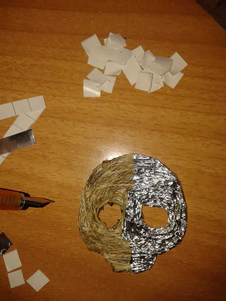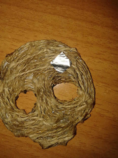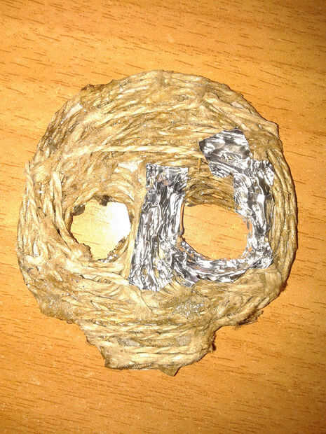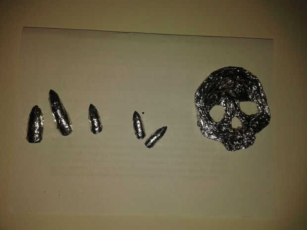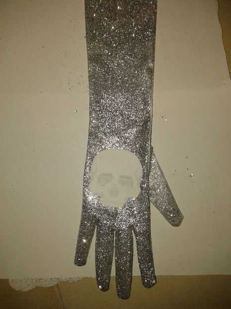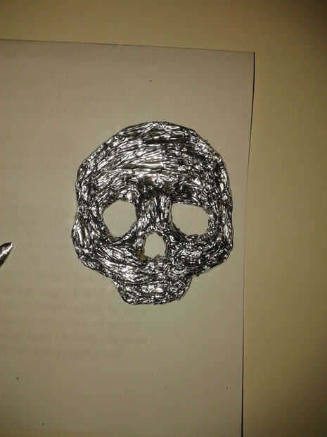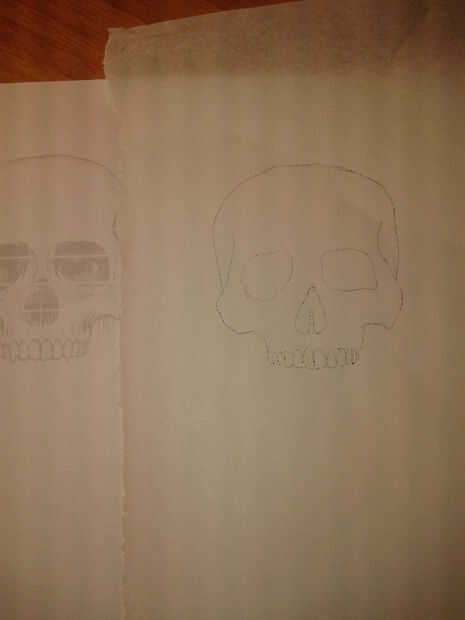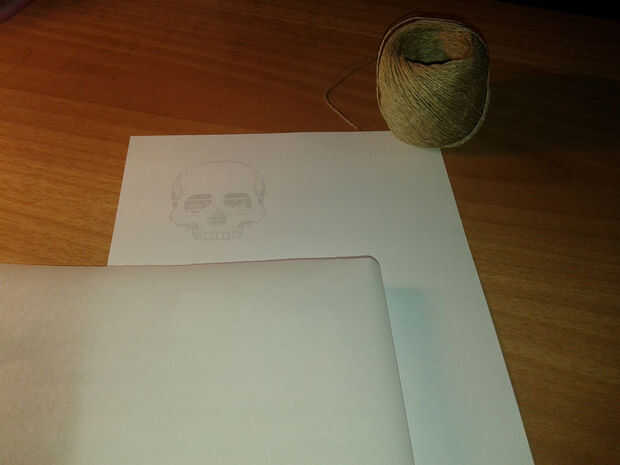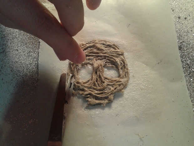 Encontrar una imagen de la calavera te gusta y traza el ountline en el papel de la hornada. Pegamento del aerosol en su bosquejo y cubrir todo con guita, como se muestra arriba. Deje que se seque. Cuando esté seco hueco de la zona de la nariz y tratan de imitar el acento metálico del bordado original (fue plata) cubriendo el desighn con cinta de aluminio y scratchint su superficie con un objeto punzante. Siga las imágenes de thw para más explicaciones.