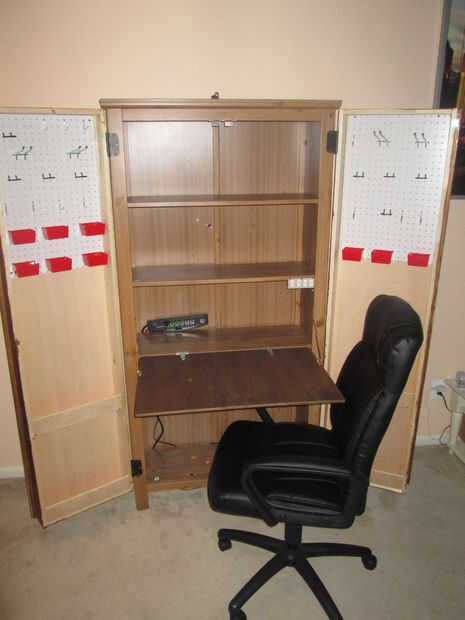 Hola a todos, hoy aquí les traigo mi más reciente creación y esta vez no tiene nada que ver con la electrónica. No tengo mucho espacio en mi departamento para tener un banco de trabajo con todas mis herramientas y equipos electrónicos para construir cosas, he estado trabajando en mis proyectos de mi escritorio y siempre es un lío y desorganizado. Así que uno muy tarde me miró a través de la sala de estar y vio la librería y yo no podía recordar la última vez compró un libro o tomó uno de la librería. Supongo que desde que compré el kindle fire. Luego se hace clic en, deshacerse de los libros y que la librería sea útil, así que me convertí en una estación de trabajo. Sí de infierno.