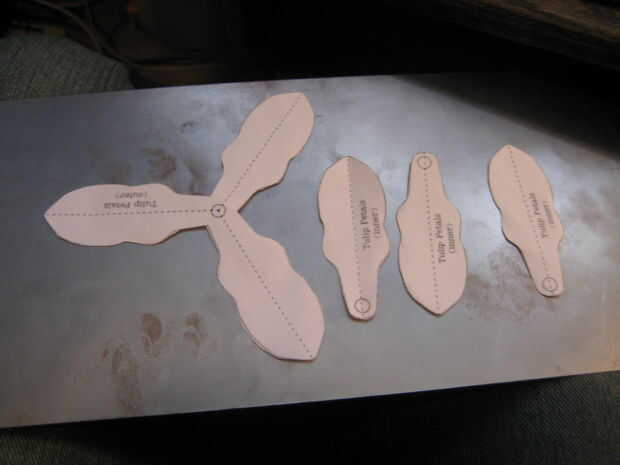 Después de que nos hemos marcado el contorno de cada forma, podemos pelar apagado y desechar los recortes. No se olvide de marcar los orificios en el extremo de cada hoja y pétalo y en el centro de la pieza de 3 pétalos.