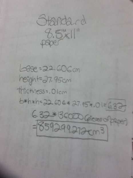 Promedio 8GB unidad flash, que contiene el equivalente de aproximadamente 136.000 Word, Google o páginas de documentos, costos desde $27-$35. El costo acumulativo de papel, lápices y tinta para la impresión en papel durante varios años terminaría siendo mucho, mucho más que esto. Esto también se ahorraría hasta alrededor 136.000 hojas de 8.5 "x 11" papel por persona. Esto da aproximadamente 859.299,3 centímetros cúbicos de papel por persona. La imagen muestra cómo se calcula esta medida de volumen.