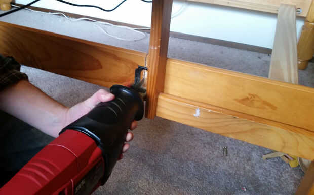 A continuación, asierra directamente a través de la viga frente delantero inferior. Hicimos nuestra corte al lado de la escalera por lo que todavía podría ser utilizado. Luego quitamos los tornillos que conectarse la viga frontal del tablero.