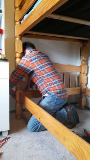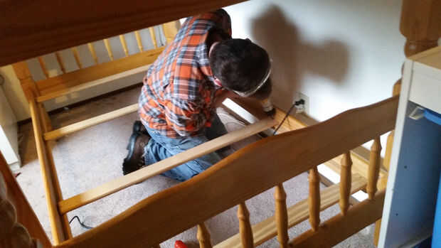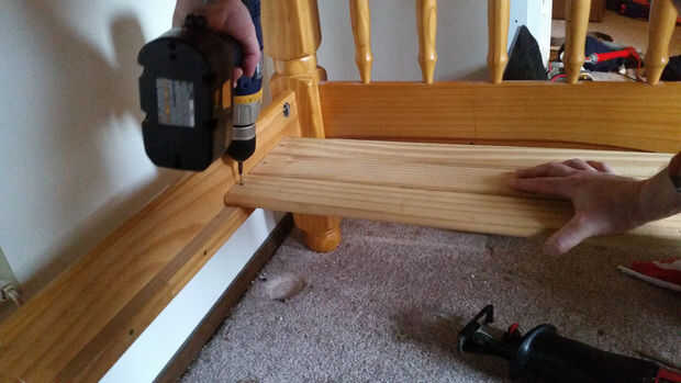 En primer lugar, nos destornilla los listones que el colchón, luego colocó al lado del otro a los pies de la cama y atornillado nuevamente en crear una zona de banco/mesa. Esto también ayuda a estabilizar la esquina donde él sube a la cama.