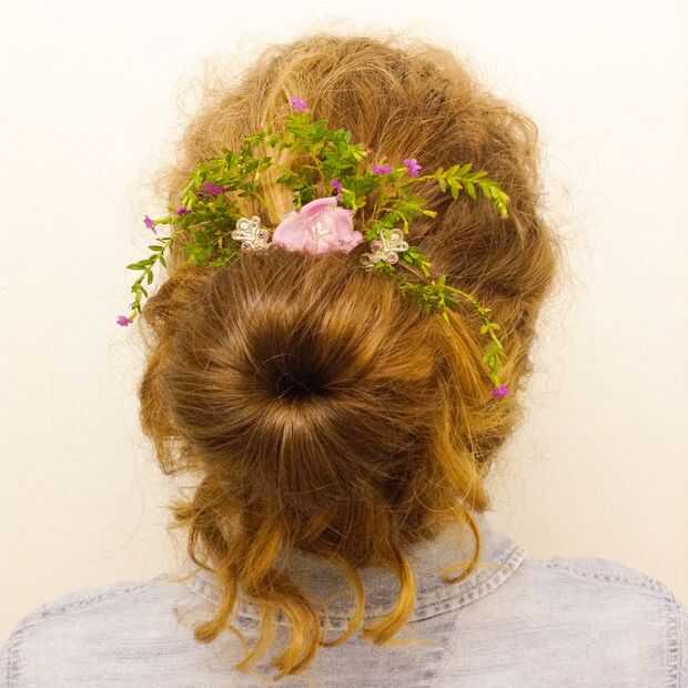 Este cabello updo es rápido de hacer y requiere sólo un clip de pelo para fijar, o, si lo desea, un pin y unos deslizadores. Es fácil decorar con adornos de elección. Si tu cabello no es rizado, rizar con un rizador antes de peinarlo. Este peinado só