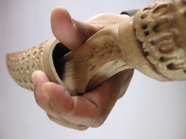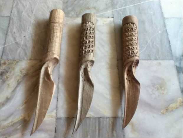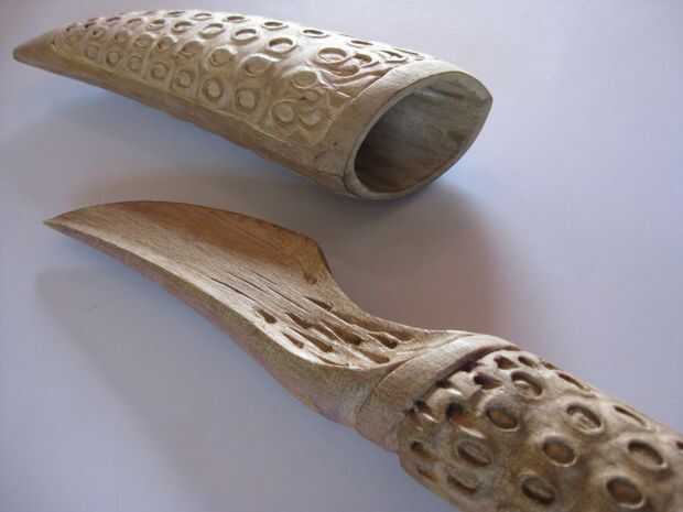 El molde maestro Vibroespada y la vaina fue tallado en bitukling, conocido localmente como 'siglo de madera'. Siglo la madera es una madera suave, ideal para trabajo de detalle. Las ampollas alrededor del mango hasta las crestas irregulares a lo largo de la virola y el talón de la cuchilla, realmente da el molde resultante de la madera un aspecto orgánico.