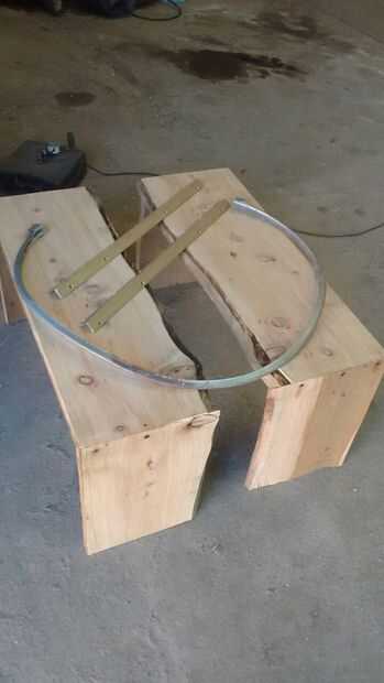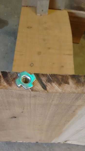 Hice el asiento para el vidrio con la inapropiada y angular en las patas clavé cuatro tuercas araña q serviran para nivelar la mesa, compensando las diferencias de espesor y altura de las maderas.