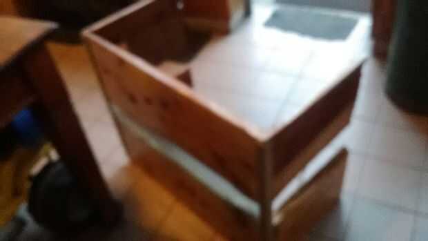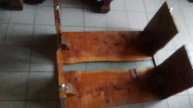 Hice cortar un vidrio nuevo el serpenteante borde previamente acanalado y con el perfil hierro ángulo permiso de 3/4 '', pintado de dorado, uní todo atornillandolo a las maderas y encastrando el vidrio en el medio. Este perfil de hierro da la firmeza necessária para sujetar ambas partes de madera con el vidrio intercalado.