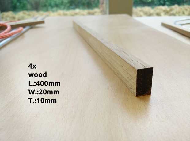 4 piezas de madera con dimensiones: 400 x 20 x 10 mm.