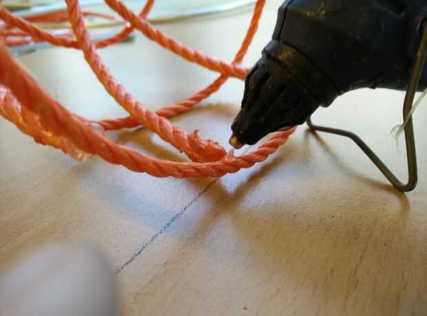 3. conectamos los pedazos de cuerda 1 por 1 en el círculo más grande que hemos hecho. Esto lo podemos hacer muy fácil con un pegamento caliente!