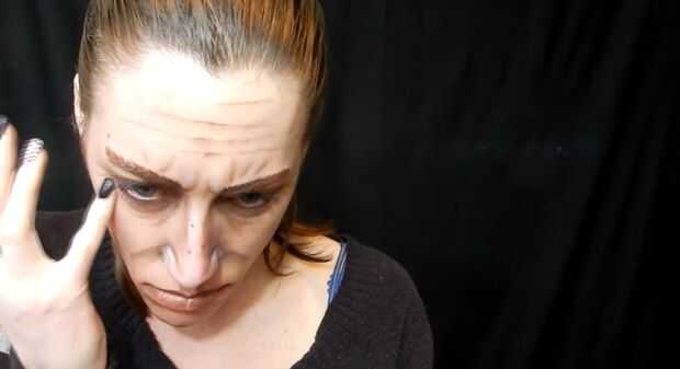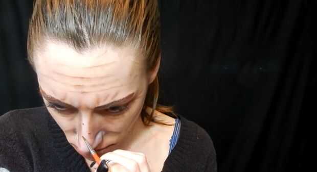 tiene manchas en su cara, así que tomó una pintura de cuerpo marrón y añadió tres puntos en mi nariz y un punto debajo de mis ojos.