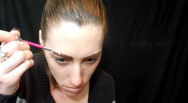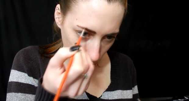 llené en mis cejas haciéndolos pintura de cuerpo más grueso, más cuadrado y ya usando café. Entonces tomando un poco látex añadí a guiones en una ceja, esto va a ser una cicatriz más adelante.