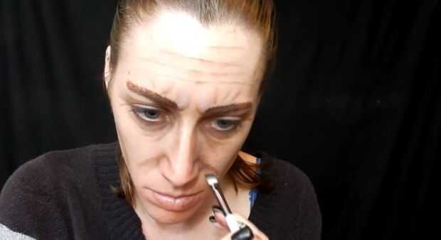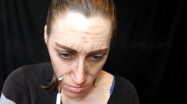 Añadí arrugas saliendo de su nariz usando ese mismo marrón y oscurecido por la sombra debajo de la nariz mediante el uso de sombra de ojos gris.