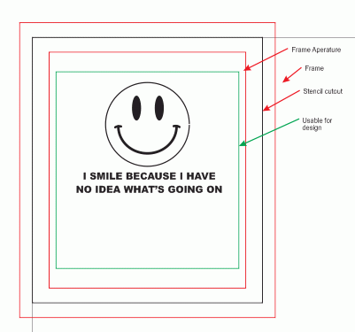 Sólo el marco negro y la obra de arte están en una capa imprimible.  El marco (rojo) y pauta de espacio utilizable (verde) están en una capa no imprimible.