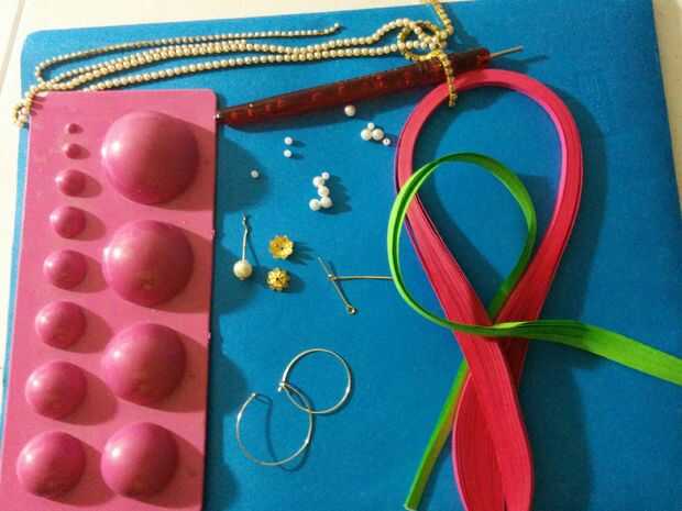 1. papel encañonado rayas: Rosa - verde - 3 tiras (se puede elegir cualquier 2 color) y tiras 5 2. Pendiente aros - 2 vigas de 3 y las perlas para la decoración. 4. mod Podge (o cualquier otro pegamento) 5. Herramienta quilling 6. 3D quilling molde para dar forma a JewelryKundan 7. pernos del ojo - 2 8. Perno de T