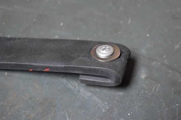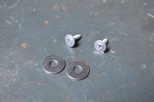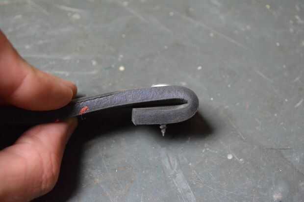2. Corte la correa. Añada una arandela para el tornillo y empuje a través de la correa. Dobla los extremos por lo que la correa se sentaría el tablero un poco, además de que da los tornillos más que morder.