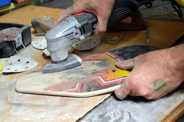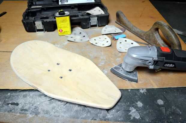 2. luego es tiempo de pulir la placa y quitar la pintura. Usé una lijadora eléctrica para esto y viene encima muy fácilmente.
