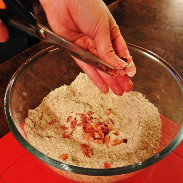 Agregar el tocino por picar en trozos pequeños, utilizando tijeras o un cuchillo.