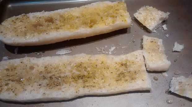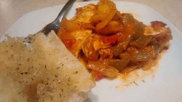 El pan es super rápido: mezclar mantequilla derretida, aceite de oliva, y especias que tengo a la mano; y en el horno 5-10 minutos. Finalmente, todo se hace! Tiempo total de esta manera con salsa precalentado unos 30 minutos. De ahora en adelante voy a hacer la parte superior de la estufa de pollo: cocinar hasta que esté listo, picar un poco, agregar verduras y salsa, llevar a hervir e inmediatamente, hierva a fuego lento 15 minutos Enjoy!