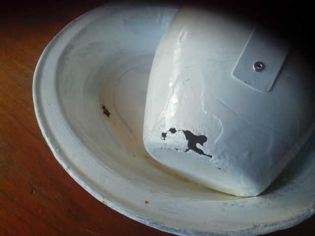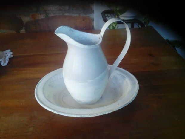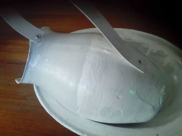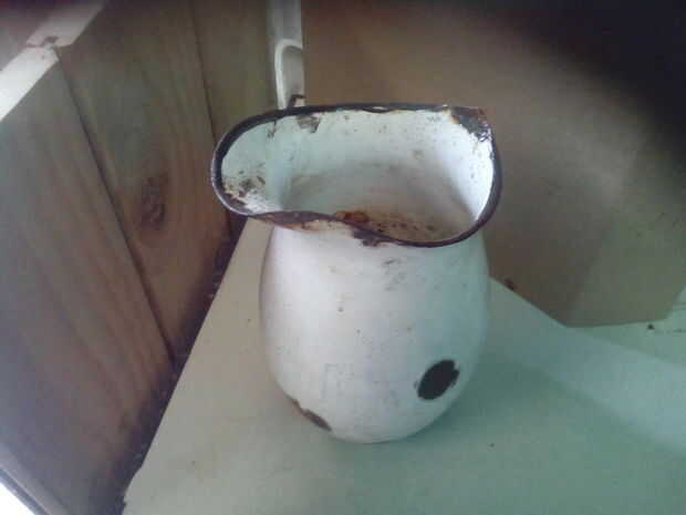 Hacer la manija con 30 cms de la rebanada lata, clavado a la jarra y luego pintado con un anti moho pintura y recupera la belleza original de su forma