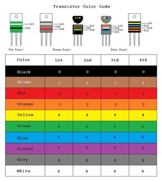 A menos que repara o revertir Ingeniero electrónica más viejos como yo, no tendrá mucho uso para los códigos de color del transistor. Al mismo tiempo eran comunes pero no son de mucha utilidad hoy en día. El código de color supone prefijos estándar transistor como 2N transistores de JEDEC. Los dígitos significativos son códigos de color EIA estándar de dos a cuatro dígitos significativos leen de arriba a abajo. Cuando las barras de color en la parte superior del transistor se leen de izquierda a derecha.