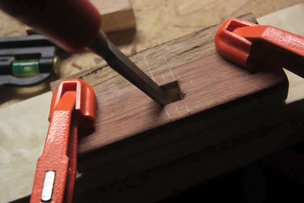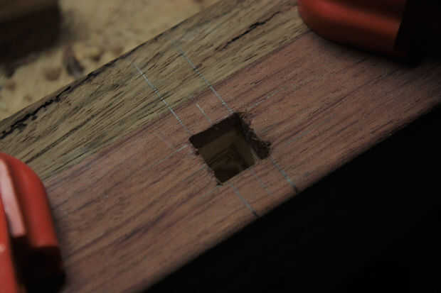 Un buen ajuste alrededor de los valores cuadrados se hacen para un medidor exacto, así que tómate tu tiempo aquí. Usé un formón de media pulgada para cortar con cuidado, el exceso de madera alrededor del agujero hasta que fue cuadrado para arriba y ajuste perfectamente alrededor de los valores cuadrados. Unas pasadas con una tira fina de papel de lija le dio un gran ajuste.