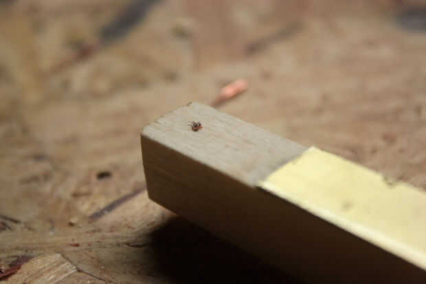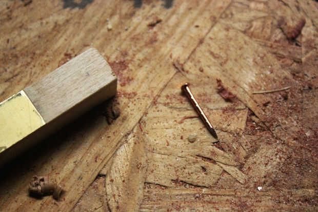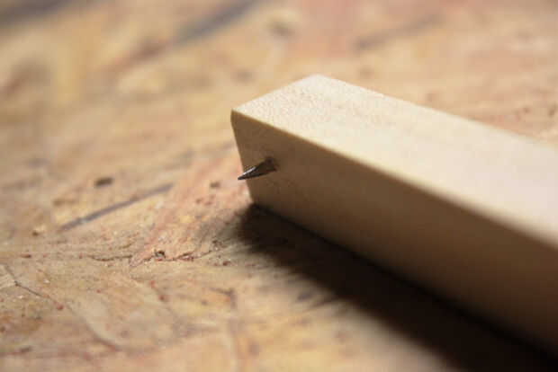 Usé una 1/16 broca para taladrar un agujero piloto cerca del extremo de la culata cuadrada como no quería que la madera para dividir. El clavo justo calcen bien bastante que no saldrá a través de un uso normal, pero poder empujar hacia fuera si necesita afilar o cámbielas.