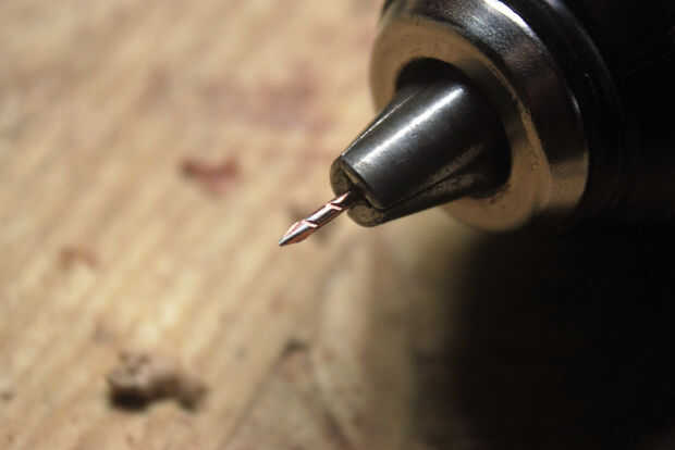 Este es un indicador de estilo de pin y el pin es simplemente un clavo de acabado con la cabeza cortada de ella. Una vez que la cabeza está apagado, me caben en el portabrocas y luego afilar con un trozo de papel de lija de grano 180.