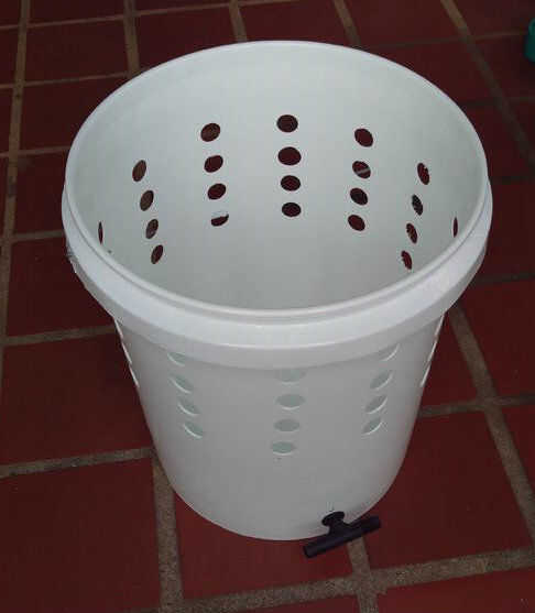 Antes de cualquier modificación a sus cubos, asegúrese de que su coladores quepan en tus cubos. Usted puede tener unas tijeras y recortar los bordes para conseguir que se ajuste. No pude encontrar ningún coladores que eran decentemente a un precio, así que compró en su lugar recipientes de mezcla y perforado unos agujeros de 1/2" para permitir el flujo de agua. Con tijeras, recortado los bordes y resbaló justo en los 5 galones cubos.