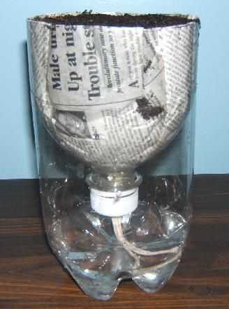 Puse agua en ella y coloca la taza dentro. Debe haber suficiente agua para la mecha para colgar, pero no tanto que toque la tapa. He encontrado que mucha agua aliente las algas para crecer desde pequeños trozos de tierra que caen a través del orificio en el periódico contaminan el agua potable. Esto no es beneficioso, porque este diseño pretende alimentar constantemente la planta de agua potable y algas hará más difícil para el agua llegar a la tierra.