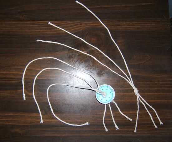 En la tapa, me alimenta el tres pequeños tramos de cordón de algodón a través del agujero grande en el centro de la tapa de la botella y echaron para que el nudo quede sobre el agujero en el interior de la tapa. Los extremos cortos se cuelgan en el agua, y los extremos largos subirá en el suelo para alimentar las raíces.