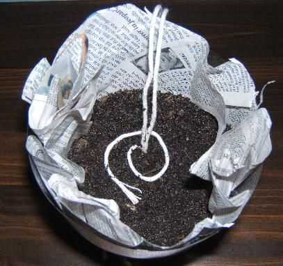 Me levanté la mecha en el centro de la Copa y comenzó a poner el suelo. Tener la mecha suben en medio de la tierra le ayuda a absorber el agua más rápidamente y permite que las raíces para llegar a ella mucho más rápido que si las tres líneas se separaron y a los lados.