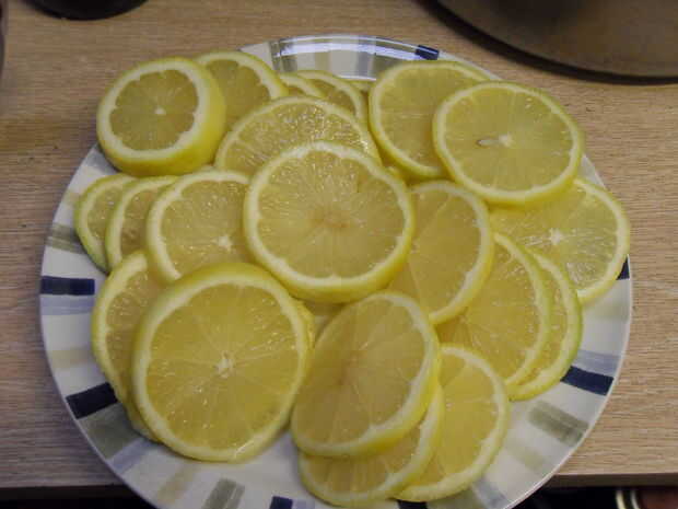 Pele los cuatro limones y luego cortar en rodajas gruesas.