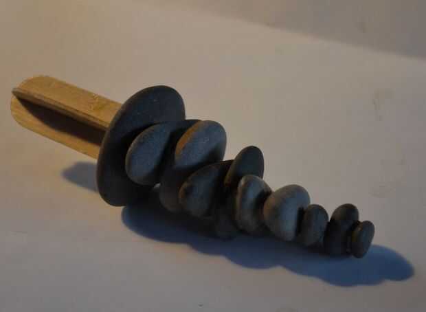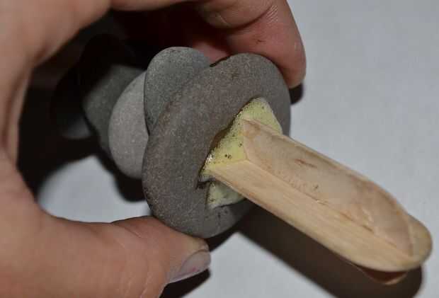 Pegar el palo a la piedra más grande. Si sale algún pegamento no importa porque será de todos modos se esconden en la tierra.