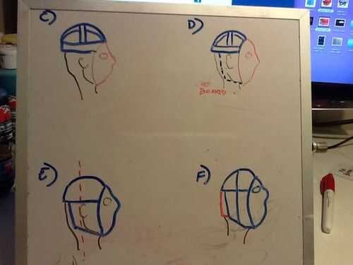 Una vez que tienes tu corona de cartulina, pegar la máscara de hockey en el frente (foto C). A partir de ahí, empezar con poner cartón a los lados del casco. (Foto D). Si usted puede hacer esto con una pieza de cartón por cada lado, más potencia, si utilizas varios pedazos, eso está bien también. Asegúrese de que construir más allá de sus oídos, ya que tendrá un punto de referencia para terminar la parte posterior del casco. En este punto, usted quiere cortar con cuidado la máscara en la mitad, poco más allá de la oreja, que le dará un delantero y trasero (foto E). por último, terminar la mitad trasera de cartón para cubrir la parte trasera de su cabeza (foto F). Cuando pones juntos, debe cubrir completamente la cabeza.