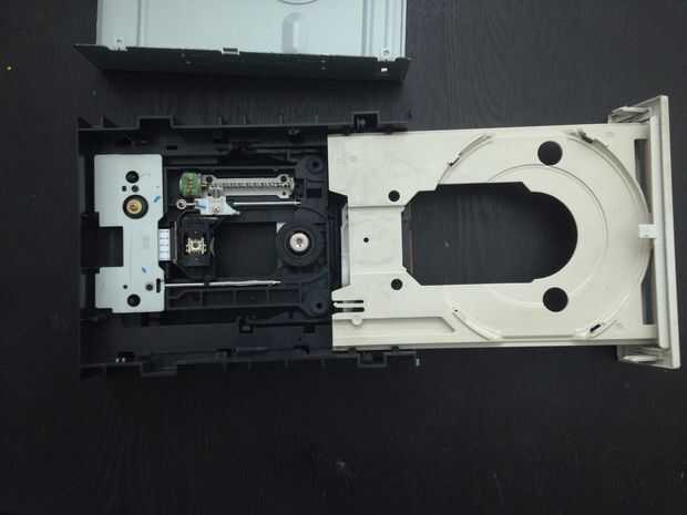 Ahora debería ver un par de tornillos que afianzan el PCB, aflójelas y con unas tijeras corte de los cables blanco como se muestra en la foto de arriba. Dejar a un lado el PCB y voltee la unidad de CD para probar el mecanismo de apertura de la puerta.