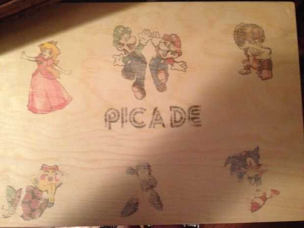- La madera casi al instante absorberá la tinta y se seca muy rápidamente. He añadido un texto de estilo, para mostrar el botón de encendido y mi 'picade'. Una vez que has resuelto todas tus imágenes y texto, aplicar un par de capas de laca clara a su caja. Esto hacen sus imágenes pop un poco y proporcionar cierta protección de la luz. La madera de estas cajas realmente absorbe, por lo que recomiendo al menos 3 capas, si no 5-6.