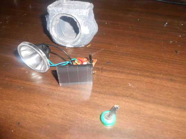 En la foto ves un pequeño circuito y una batería pequeña 1,2 voltios en 40mah, un pequeño panel solar, un reflector de led /. Todo muy sencillo. Antes de preguntar, no hay ningún diodo de bloqueo en este circuito. Fue diseñado para no tener uno. funciona de la misma como lo haría con uno.