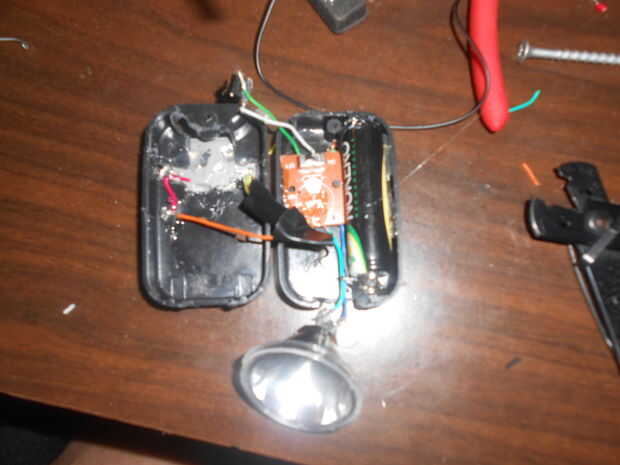 5 - reconecte todo y coloca todo en su lugar. Me hotglued el panel, el botón y el circuito en el lugar. Me terminó utilizando el puerto USB para el reflector de luz, también caliente pegué para mayor seguridad.
