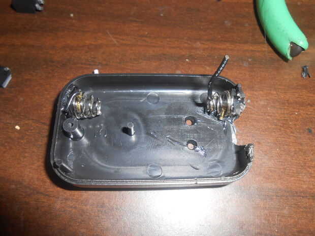 En segundo lugar que necesitaba hacer un soporte de la batería. Tomé dos resortes de un viejo tablero de circuito y caliente pegado dentro de la caja corte lentamente para que sea más corto por lo que podría caber la batería perfecta. Yo entonces soldar dos cables pequeños que por lo que más tarde puedo soldar los cables de la batería que.