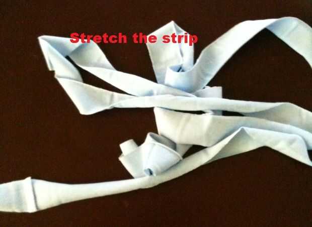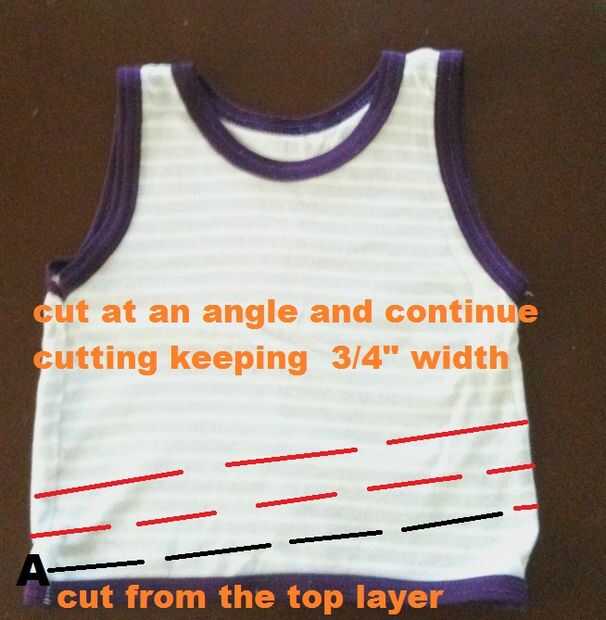 Conseguir su camiseta y la elevación de la capa superior y el inicio del corte en un ángulo... mantienen un ancho de 3/4" y cortan dando vuelta la camiseta...