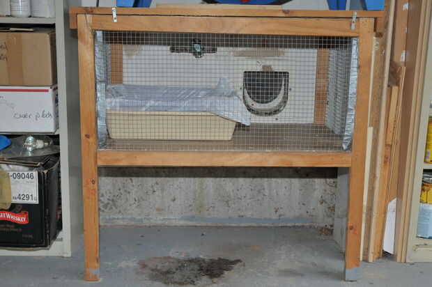 Una vez que has verificado que tienes un buen lugar para construir el recinto del garaje, hacer un bosquejo de lo que se necesita para que los materiales de soporte con un marco y un piso de madera contrachapada. En mi caso, hice el recinto 20"(de la pared en el garaje) y 36" de ancho. La plataforma es de unos 16" desde el piso del garaje para dar cabida a la apertura de la casa a nivel del piso. Por supuesto tienes que prever un medio abrir la caja para llegar a la caja de arena para la limpieza.