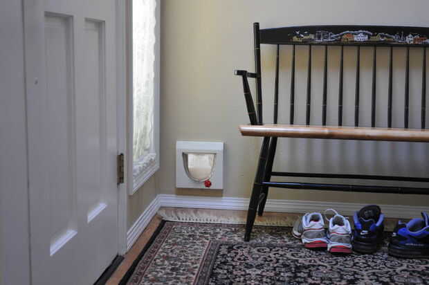 He insertado un pedazo de metal intermitente que consiguió en la tienda de hardware en la abertura y esta curva en forma de tubo para hacer un pasaje limpio a través de la pared entre las aberturas.