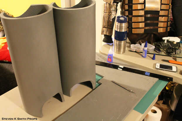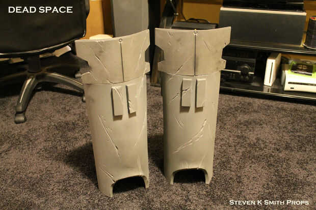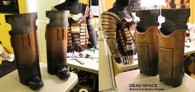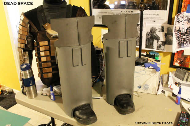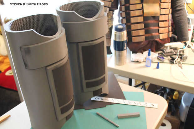 Los protectores de espinilla y rodilla se construyen fuera de espuma de EVA.  Se enrolla la espuma y calor forma y pega en su lugar.  Detalles de espuma adicionales se agregan a la parte posterior y se utiliza espuma de arte así.  La armadura está angustiada con la Dremel y una vez más sella con Modge Podge y pintado con negro Krylon.  Todas las latas de traqueteo metálico se utilizan otra vez para crear la capa base de pintura.