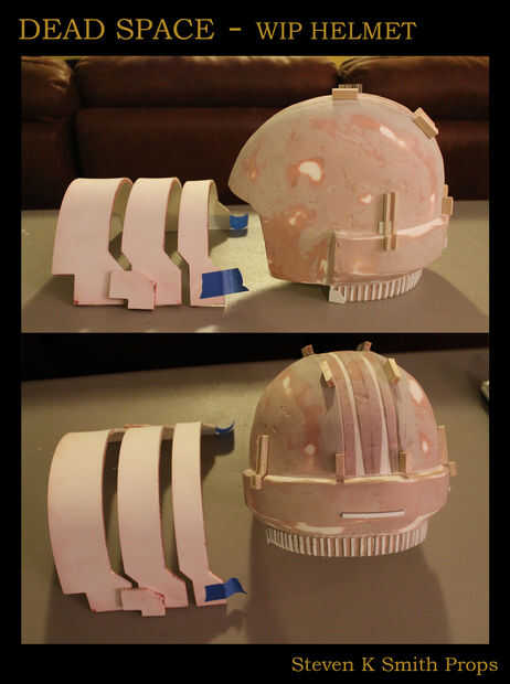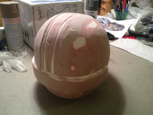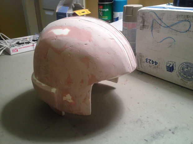 Los detalles de la línea en la parte superior de la cabeza se hicieron mediante pin archivos muy lenta y muy cuidadosamente. La última fotografía muestra el casco con el detalle de la costilla a lo largo del protector de cuello y los bloques que se pega fuera de la parte posterior y superior. Las costillas en la parte posterior hicieron corte de estireno en pequeñas tiras y pegar luego a bondo uno por uno. Los bloques son de madera de balsa que se ha lijado y pegado en su lugar. Desde aquí el casco entero consigue una pareja capas de imprimación de Krylon rojo y se lija en húmedo para hacer las áreas de relieve suave.